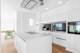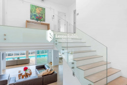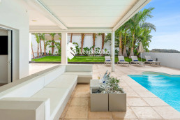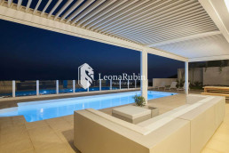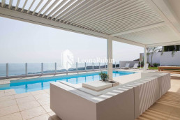 The two levels are connected by a very beautiful staircase which has the character of an inner courtyard due to the glass roof. On the lower level there are the spacious living and dining area, a modern open kitchen, a guest bedroom and two bathrooms. Directly in front of the living area is a pergola which can be electrically controlled to adjust the wind or sun protection as needed.