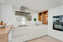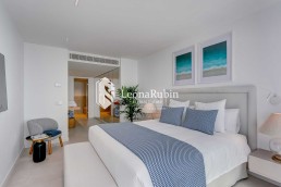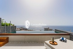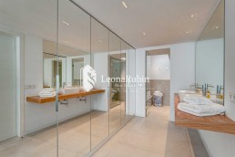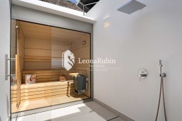 The living-dining room with the open kitchen is very bright and spacious. Floor-to-ceiling windows give access to the outdoor area with terrace and swimming pool. On this floor there is also a guest toilet close to the entrance. A staircase connects the living area with the upper floor. There are two large bedrooms with en suite bathroom and dressing room. The penthouse has also a roof terrace. On the roof terrace there are a sauna, a Jacuzzi and an outdoor kitchen.