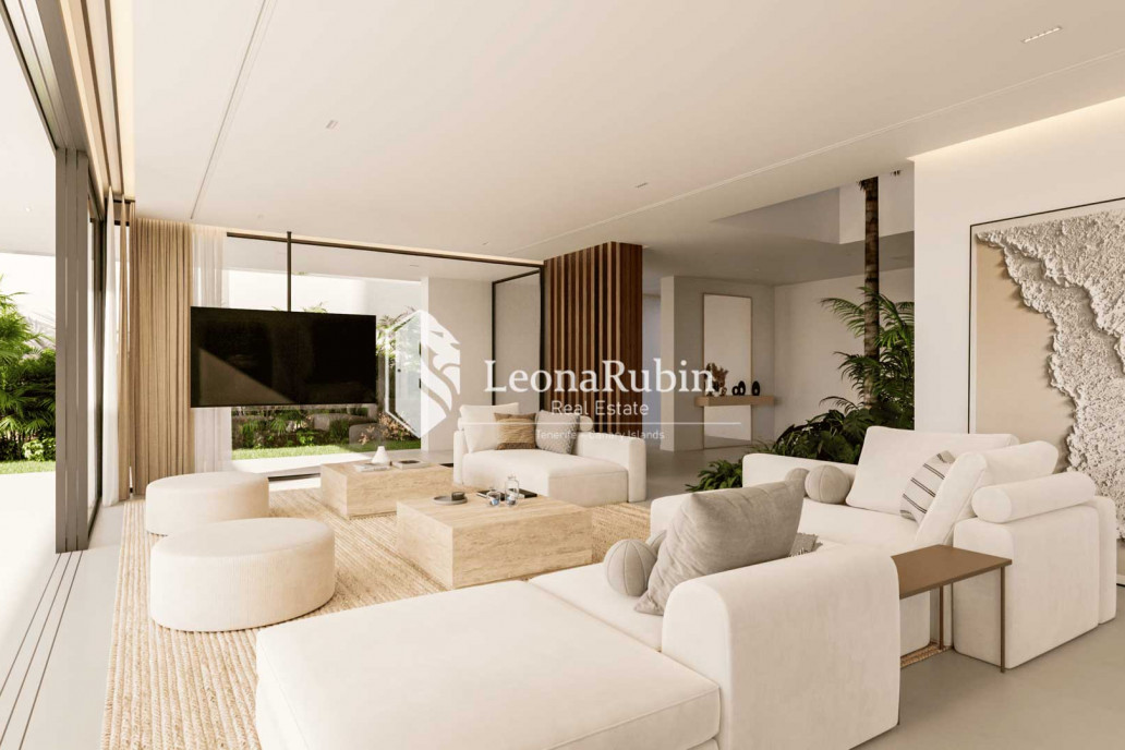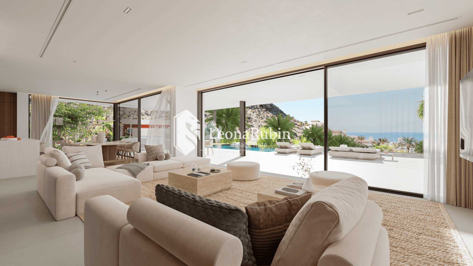 Der Eingang erfolgt zum Erdgeschoss, welches einen großen Wohn- und Essbereich mit offener Küche umfasst. Über bodentiefe Fenster erfolgt der Zugang zu der vorgelagerten Terrasse mit Infinity-Pool. Das Erdgeschoss umfasst weiter eine Gäste-WC und ein Schlafzimmer mit eigenem Bad. Das Obergeschoss beherbergt das Hauptschlafzimmer Bad en Suite sowie zwei weitere Schlafzimmer mit eigenem Bad. Alle Villen haben sowohl ein großes Untergeschoss, wo sich u.a. die Garage befindet, und eine großzügige Dachterrasse. Sämtliche Geschosse können per Aufzug erreicht werden.