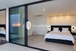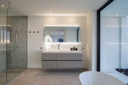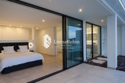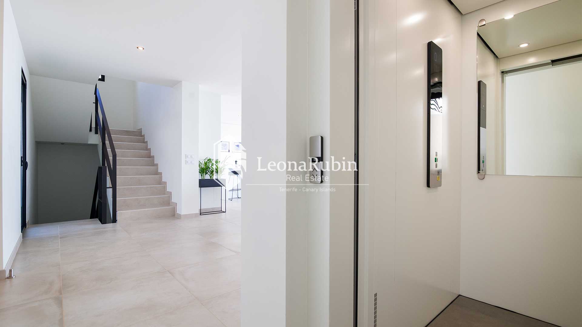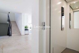 Auf insgesamt drei Ebenen, die neben einer Treppe auch über einen stylischen Lift miteinander verbunden sind, verteilen sich 4 Schlafzimmer und 5 Bäder. Das Hauptschlafzimmer mit Bad en Suite, inklusive einer freistehenden Badewanne, befindet sich auf der oberen Etage. Ein weiteres Gästeschlafzimmer liegt ebenfalls auf dieser Etage. Die Erdgeschoss umfasst ein drittes Schlafzimmer mit Bad en Suite sowie den hellen, geräumigen Wohnbereich mit offener, moderner und voll ausgestatteter Küche. Im Untergeschoss sind eine große Suite mit Badezimmer en Suite und Patio, der Hauswirtschaftsraum und ein Technikraum.