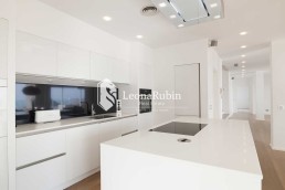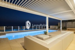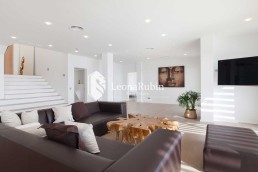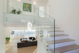 Die zwei Ebenen, sind über ein sehr schönes Treppenhaus, das wegen des Glasdaches den Charakter eines Innenhofes hat, miteinander verbunden. Auf der unteren Ebene befinden sich der weiträumige Wohn- und Essbereich, eine moderne, offenen Küche Küche, ein Gästeschlafzimmer und zwei Bäder. Über viele bodentiefe Fenster kann der Zugang zum Außenbereich erfolgen. Direkt vor dem Wohnbereich ist eine Pergola installiert, die elektrisch gesteuert werden kann, um den Wind- oder Sonnenschutz je nach Bedarf anzupassen.