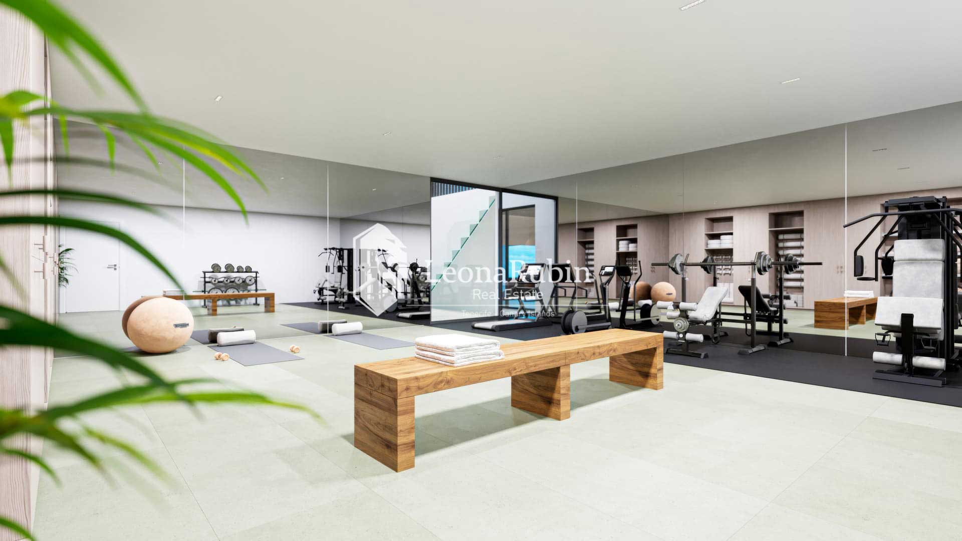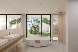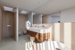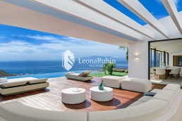 Der offene Wohn- und Essbereich mit einer ebenfalls offenen, großen Küche bildet das Zentrum der oberen Etage. An diesen schließt sich an einer Seite eine mit einer Pergola überdachte große Außenfläche an. Diese kann als Ess- oder Chill-out-Bereich genutzt werden. Auf der anderen Seite des Wohnbereiches erfolgt der Zugang zu luxuriösen Hauptschlafzimmer mit Bad en Suite und toller Ankleide. In einem separaten Teil der Etage befinden sich die Garage für zwei Autos, ein Gästebad und ein Hauswirtschaftsraum.