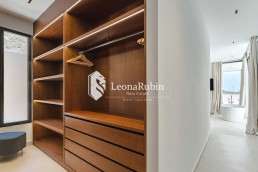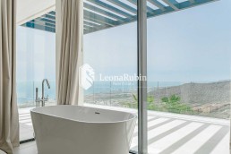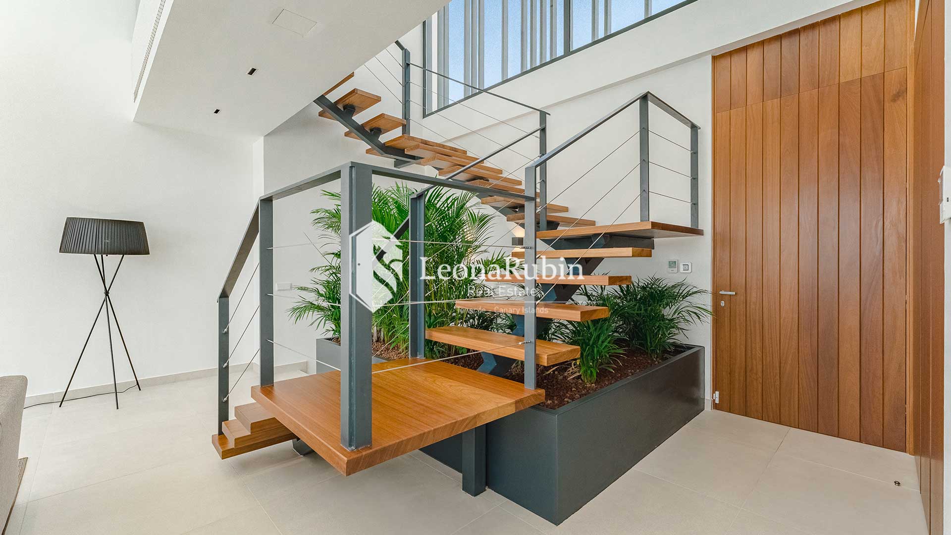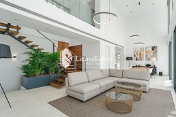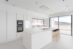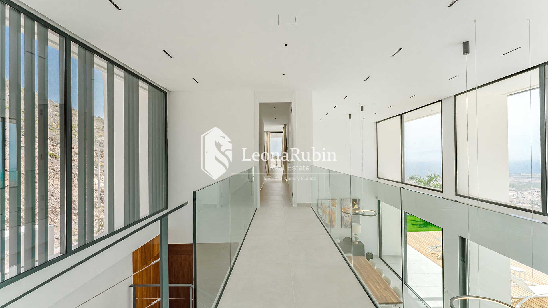 Der Wohnbereich hat eine doppelte Deckenhöhe und bildet eine Einheit mit der vorgelagerten Terrasse sobald die bodentiefen Fenster geöffnet sind. Vom Wohnbereich geht einerseits die offene Küche und andererseits ein großes Gästeschlafzimmer mit Terrassenzugang sowie ein kleineres Gästeschlafzimmer, welches sich ein Badezimmer teilen, ab. Das Obergeschoss ist räumlich zweigeteilt in den privaten Bereich mit dem Hauptschlafzimmer mit Bad en Suite, Ankleide sowie privater Terrasse und einen Gästebereich mit einem eleganten Gästeschlafzimmer mit Bad en Suite und Terrasse. Beide Bereiche sind über eine Galerie mit Glasgeländer verbunden, zu der auch die Treppe aus dem Erdgeschoss führt.